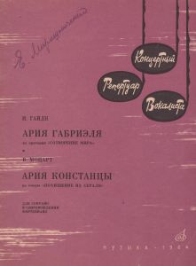 Ария Габриэля : из оратории “Сотвоение мира” [Ноти] / Й. Гайдн. Ария Констанцы : из оперы “Похищение из сераля” / В. А. Моцарт : для сопрано в сопровождении фортепиано . — Москва : Музыка, 1964. — 30 с. — (Концертный репертуар вокалиста). — Номер дошки: 726.