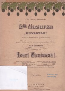 2-de Mazurka [Ноти] : “Kujawiak” : Danse nationale polonaise : pour Violon aves accompagnement de Piano ou d’Orchestre / Henri Wieniawski ; arr. par son frere J. Wieniawski. — Edition pour Piano seul. — Moscou : P. Jurgenson, [19–]. — 7 c. — Присвята: A Mademoiselle Constance Korzuchowska. — Номер дошки: 25438.